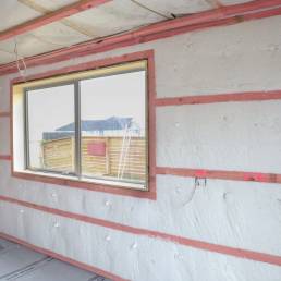 The system creates a thermal and acoustic barrier. The product completely fills gaps, voids and hard to reach areas around pipes, electrical wires and fixtures.